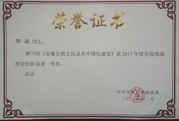 邵敏教授的论文在五篇一等奖论文中,是唯一的个人研究成果,其他4篇都是课题组集体研究成果。邵敏教授认为,坚持宗教的中国化方向,就是要在中国特色社会主义伟大旗帜下,着重把握和解决好宗教的国家本位、政治底线、思想基础、文化适应、价值取向和有效传播等重大问题。我国宗教坚持中国化方向,是我国各种宗教与我们国家的社会主义社会这一社会性质“相适应”的深化和具体化;只有坚持宗教的中国化方向,才能充分发挥宗教工作的统战价值。安徽传统宗教源远流长,资源富足,在佛教的“本土化”等方面贡献卓著,应借鉴和发掘利用“人间佛教”等理论和实践,写好我国宗教中国化的安徽文章,为宗教的中国化发展做出更大贡献。邵敏教授的文章明确界定了宗教的中国化的概念,指出在当代中国,宗教的中国化,就是按照宪法精神,赋予中华人民共和国境内的所有宗教以根本大法规定的政治的、经济的、文化的和社会的性状;深入论述了宗教中国化发展的具体路径,指出宗教的中国化就是要促进宗教与社会主义社会相适应,切实增进国家认同、政治共识、思想共识、文化共识和价值共识,推进宗教话语的中国化;从学科建设、思想建设、文化融合和平台建设等方面,探讨了我省宗教中国化发展的若干对策,文章具有重要的理论意义和现实意义。