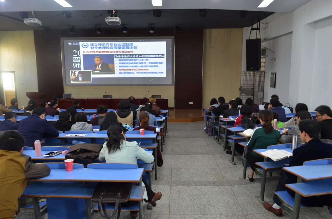 4月18日,教育部高等教育教学评估中心在南京召开2018年度普通高等学校师范类专业认证培训会,副校长张群和教务处、教师教育学院负责人参加培训会。纽约国际官网各师范专业负责人、相关学院教学秘书、全体学科教学论教师和教育专业硕士生导师、教师教育学院全体教职工在文津楼报告厅集中收看了会议直播。