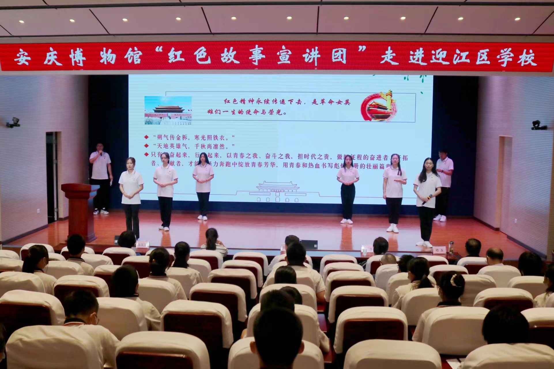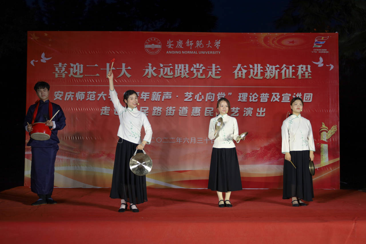 “党的政策就是好,国泰民安看今朝,身在中国多自豪……”“我骄傲!”七一前夕,“青年新声∙艺心向党”理论普及实践团队走进安庆市迎江区人民路街道,开展惠民文艺演出,用群众喜闻乐见的“口头语”,宣传党的十九届六中全会精神,对党的百年奋斗重大成就和历史经验进行红色解读。和他们一样走街串巷开展宣讲的,还有人文学院“红心相传”社会实践团、“红色筑梦 青年求索”教育实践团,马克思主义学院“追寻旌德红色文化”社会实践团等。