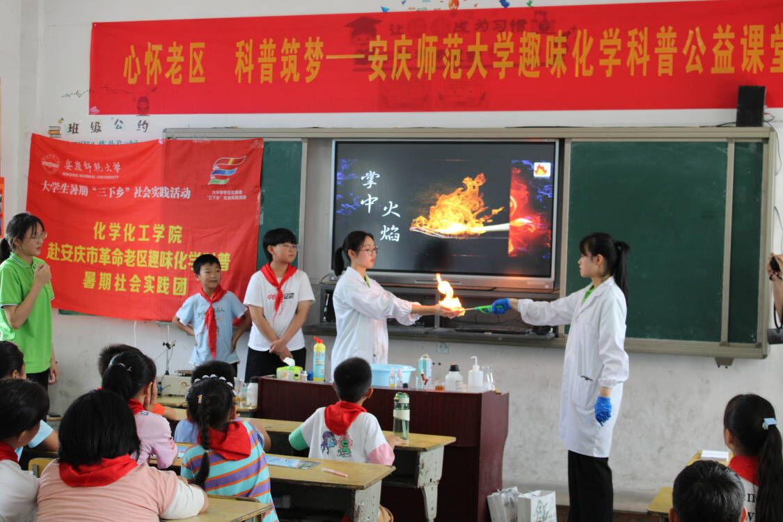 在安徽省科技馆、在安徽广善公益服务中心、在太湖县牛镇镇安坪希望小学,化学化工学院科普化学实践团队为当地的孩子们带来了“多彩的化学视觉之旅”主题科普课。“热冰艺术”“金色的海洋”“多彩的大象牙膏”“火焰掌”等富有趣味性和观赏性的科普化学实验,让孩子们体验到了多变的化学实验,感受到了化学的神奇“魔法”。