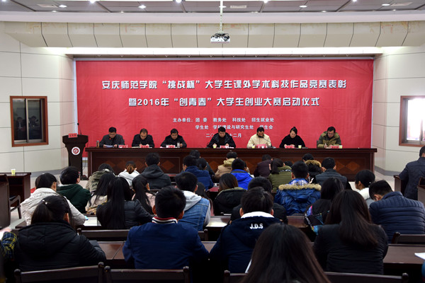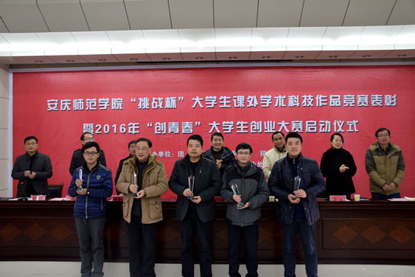 仪式上,张群和陈光明共同为安庆师范学院 “大学生创客空间”揭牌。陈光明公布了校第五届“挑战杯”大学生课外学术科技作品竞赛结果并宣读表彰决定。出席领导为“挑战杯”优秀指导教师、获奖团队颁发奖证,为优秀组织单位资源环境学院、计算机与信息学院、人文与社会学院、生命科学学院、文学院颁发了“挑战杯”、“优胜杯”。