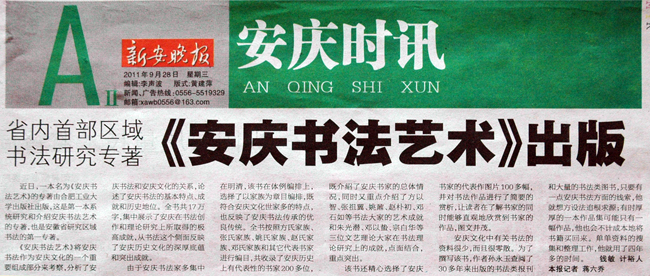 近日,纽约国际官网党委宣传部、统战部副部长孙永玉老师书法研究专著——《安庆书法艺术》由合肥工业大学出版社出版。该书将安庆书法作为安庆文化的一个重要组成部分来考察,分析了安庆书法和安庆文化的关系,论述了安庆书法的基本特点、成就和历史地位。全书共17万字,集中展示了安庆在书法创作和理论研究上所取得的极高成就,从书法这个侧面反映了安庆历史文化的深厚底蕴和突出成就,是第一本系统研究和介绍安庆书法艺术的专著,也是安徽省研究区域书法的第一部专著。该书一经出版,立即引起了新华网、中国日报网、安徽教育网、中安在线及《新安晚报》、《安庆晚报》等省内外多家媒体的关注和报道。