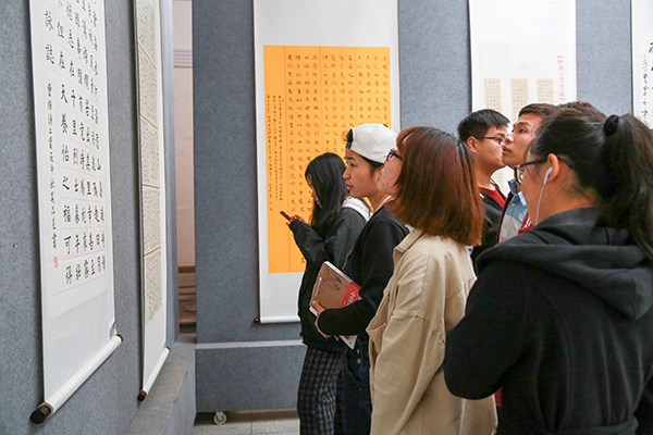4月7日,迎120周年校庆“翰墨春风”书法精品联展在美术学院展厅举行。副校长刘友忠、市人大常委会副主任刘飞跃、市政协副主席洪爱敏和纽约国际官网原党委书记赵晓和、市文联党组书记尹思放等领导嘉宾饶有兴致地观看了展出的各类作品。