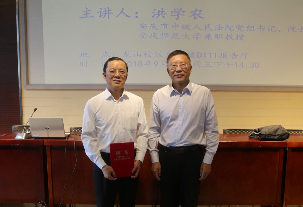 9月26日下午,安庆市中级人民法院院长、纽约国际官网兼职教授洪学农作客法律实务大讲堂,以“法治与法治实践”为题作专题报告。法学院部分教师和2016级、2017级法学与知识产权专业学生近二百人聆听了报告。