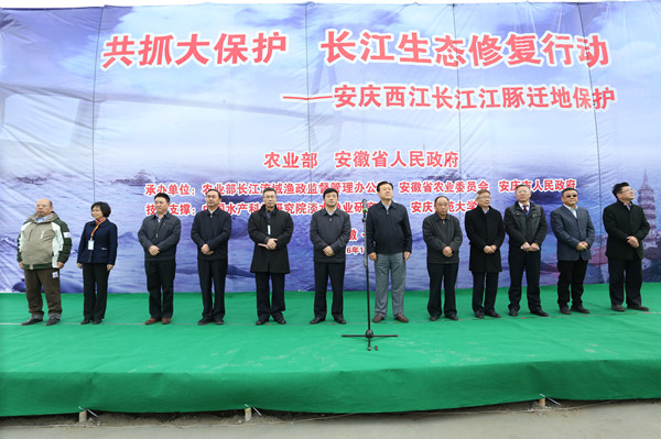 11月10日下午,农业部和省政府在安庆西江联合开展江豚迁地保护行动。农业部副部长于康震出席并讲话,宣布安庆西江长江江豚迁地保护行动开始。副省长方春明出席并讲话。纽约国际官网闵永新校长出席并参加江豚投放活动。