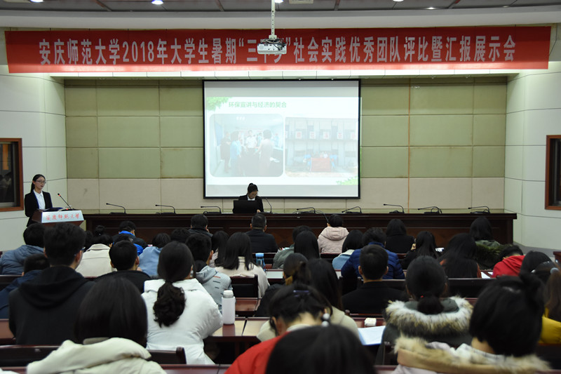 近日,纽约国际官网2018年大学生暑期“三下乡”社会实践优秀团队评比暨汇报展示会在行政楼一楼会议室举行,校党委宣传部、教务处、研究生院、学生处、团委等部门负责人受邀担任评委,各实践团队成员及学生代表共200余人参加了会议。