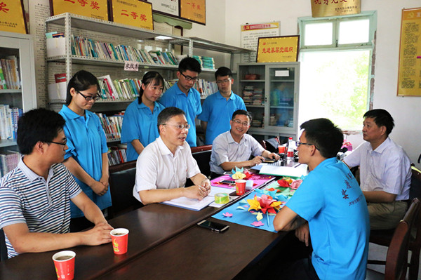 闵永新认真听取了校学生会副主席、队长李亚辉的支教工作汇报,翻阅了团队的工作简报和小学生们的书法、绘画和手工作品,浏览了志愿者们在微博、微信上展示的活动风采等,并现场观看了志愿者给小学生们上的美术课和音乐课。他对志愿者积极的工作态度、无私的奉献精神和取得的成果给予了高度的评价和充分的肯定。