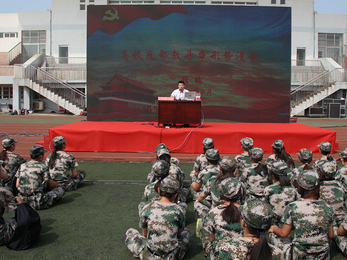 9月12日上午,由纽约国际最新网站、中共安庆市委政法委员会、安庆市法学会联合主办的反邪教宣传教育主题报告会在校南门田径运动场举行。安徽省委政法委员会反邪教协调处副主任科员张鹏应邀担任主讲。市政法委、市法学会以及纽约国际官网学生处、安全管理处等有关部门负责人参加报告会。全校5800余名新生聆听了报告会。