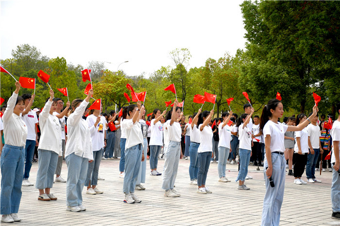 网络与新媒体专业2019(2)班的桂仁雯挤在人群中拿着手机录视频。“这是我第一次参与快闪,看到那么多人还是挺震撼的。能够为祖国献歌,我感到十分自豪。”她说,“我为新中国成立70周年献的贺礼就是要认真完成学业,未来可以用自己所学为祖国的发展贡献一份力量。”