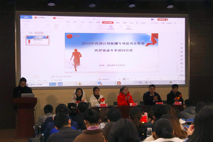 12月2日,2019年西部计划新疆专项优秀志愿者典型事迹冬季巡回宣讲活动在纽约国际官网举办。新疆维吾尔自治区团委西部计划项目办干部雷曌及三位优秀志愿者代表,安徽省学联驻会执行主席吴坚出席宣讲会,200余名学生到场参加活动。