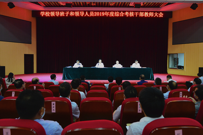 许继荣代表学校领导班子作2019年度工作总结报告,从四个方面报告学校工作。第一,落实党建第一责任,全面从严治党向纵深推进。政治建设不断加强;思想建设持续强化;干部队伍建设持续推进;基层党组织建设扎实有力;作风建设进入常态化;党风廉政建设持续深化;统战群团工作充满活力;安全稳定工作常抓不懈。第二,坚持发展第一要务,内涵建设迈上新台阶。依法治校水平不断提升;人才培养取得新成果;人才队伍建设取得新进展;学科建设取得新突破;科研工作迈上新台阶;社会服务呈现新格局;文化传承展现新作为;重大改革措施稳步推进;综合保障能力得到新提升。第三,提高政治站位,坚决打赢疫情防控阻击战。组织领导到位;责任落实到位;宣传引导到位;校园管控到位;信息排查到位;线上教育教学到位;后勤保障到位;学生返校落实到位。第四,对标对表整改,上年度综合考核反馈问题整改到位。学校高度重视上年度省委综合考核反馈意见的整改落实工作,紧密结合实际,认真制定方案,严格落实责任,6个方面27项整改措施基本整改到位,取得了积极成效。
