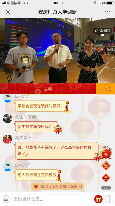 在新生报到的三天时间里,学校每天安排了两场共计8个小时的直播,并分别安排了8名学生主播,在菱湖校区、火车站、体育馆主会场和校园游四个机位为家长们介绍或解答家长们的弹幕留言。直播还邀请了学校领导和相关部门、学院负责人在镜头前向家长们介绍了学校的历史、教学、学生生活和安全管理等相关情况。