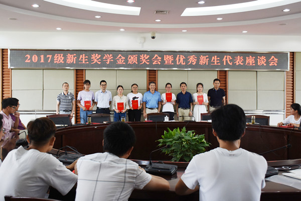 6月13日下午,学校召开2017级新生奖学金颁奖会暨优秀新生代表座谈会。副校长张群,宣传部、教务处(招生办公室)、学生处、财务处等部门负责人、部分优秀新生奖学金获奖代表参加了会议。会议由教务处(招生办公室)负责人主持。