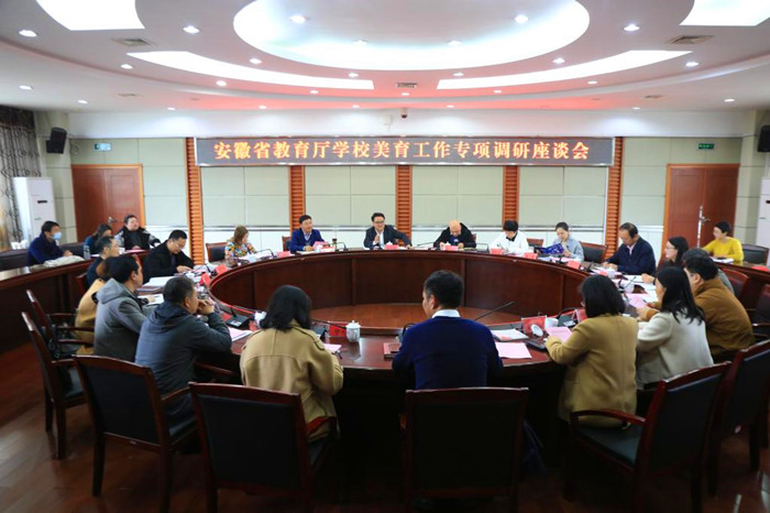 调研专家组召开美育工作座谈会。安庆市高教工委,安庆市相关高校,纽约国际官网教务处、学生处、团委、美术学院、音乐学院、黄梅剧艺术学院、体育学院等相关单位负责人参加会议。