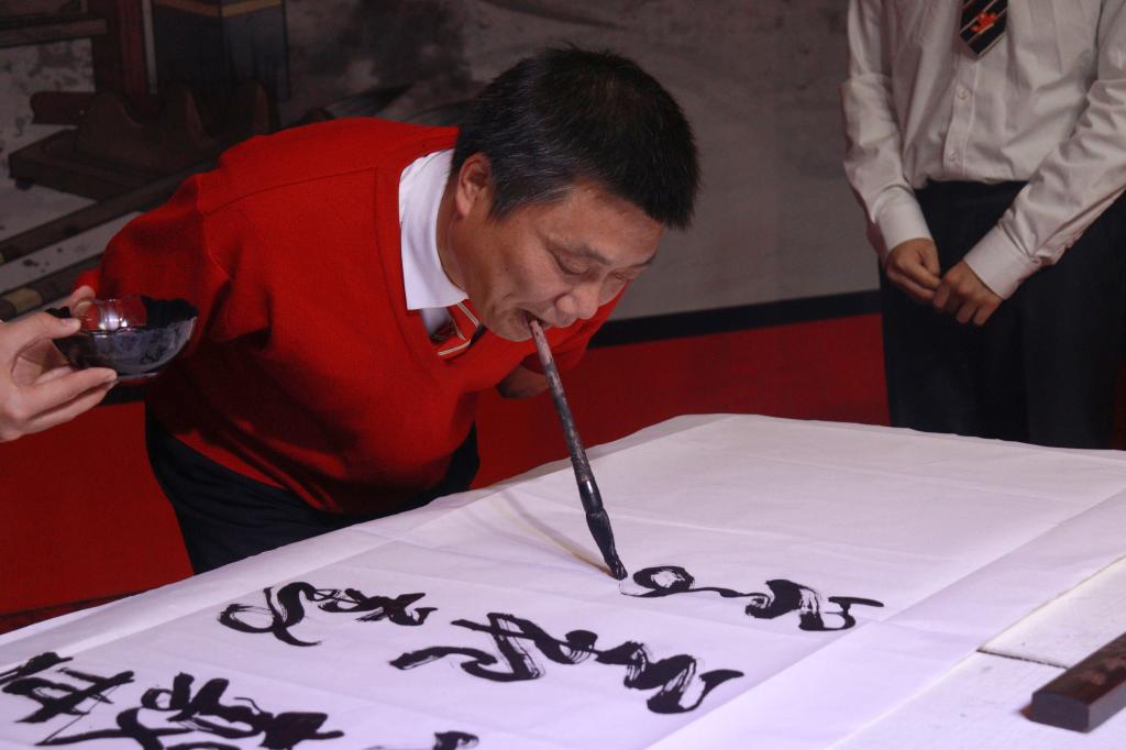 活动现场,赵靖与同学们亲切互动,并现场展示了口书技艺。铺纸、用口衔笔、蘸墨、书写……一幅“敬敷 世范 勤学 笃行”的八字校训,一幅“学无止境”的美好寄语,一幅“学贵有恒”殷切期待,三幅笔力遒劲、功底深厚的书法作品,寄托了赵靖老师对师大学子的期盼与祝福。