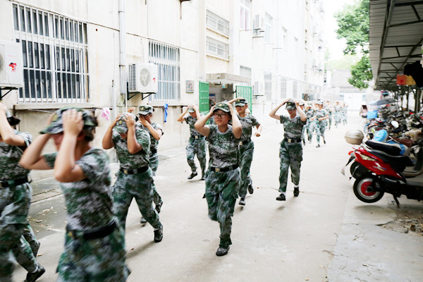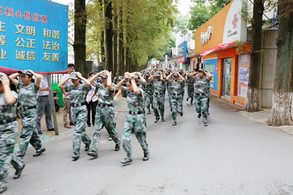 此次演练是2018级新生军训的重要科目之一,主要以“地震”为模拟场景进行紧急疏散,并由两校区各营连教官负责带领学生学习地震逃生知识。此次演练分为应急避震演练和紧急疏散演练两个步骤。下午三点整,随着信号员发出“地震警报”的信号,在寝室的参演学生迅速抱头、闭眼,蜷缩身体,躲在各自的桌底。一分钟后,“紧急疏散”信号也随之响起,参演学生在辅导员与学生公寓管理员的组织下,迅速有序地撤离公寓楼,并在指定区域集合、清点人数。十分钟后,一排排方阵展现在教官面前,演练到此结束,并获得圆满成功。