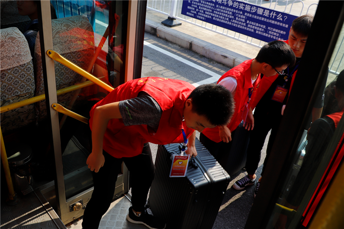 除了在火车站的50名志愿者之外,还有二百余名志愿者分散在汽车站、接送新生的公交车上和校园的每一个角落。他们有的负责引导新生到准确的位置进行报到,有的负责给新生讲解来到校园的注意事项,还有的负责给新生及家长提供矿泉水和防暑的药物。