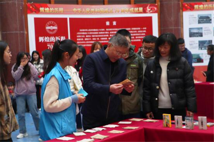 展览期间学校领导也来到图书馆展厅与师生一同参观展览。领导和老师们一边看,一边与同学们交流。“让学生们在实践中‘以小见大’,真正亲身参与并感受新中国成立70周年日新月异的变化,能激励学生们回望历史,不忘初心,立足当下,接续前进。”学生处相关负责人说。