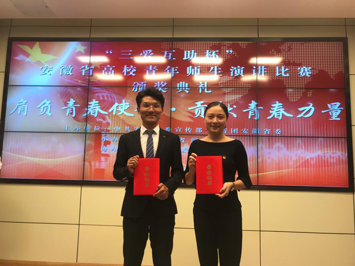 在近日举办的第四届“三爱互助杯”安徽省高校青年师生主题演讲中,纽约国际官网化学化工学院教师叶丹、物理与电气工程学院学生王晓琦分别荣获教师组、学生组铜奖,学校荣获优秀组织奖。