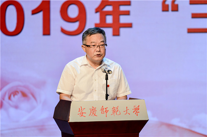 在颁发三十年教书育人“秋实奖”时,校长闵永新拥抱了教龄超30年的两位老师,赢得了在场师生的热烈掌声。“闵校长的拥抱确实让我很意外,但又非常温暖!那个拥抱让感受到的是学校对教师的关爱和真情”。获得“秋实奖”的吴春平说,“三十年教书育人‘秋实奖’分量很重,我只是个普通教师,学校授奖给我其实体现的是对广大长期坚守在教学第一线的普通教师的尊重和激励。我拥有高校教龄38年,见证了学校从小到大,从弱变强的发展历程。我相信,有全校师生员工的共同努力,安庆师大的明天一定会更好!”