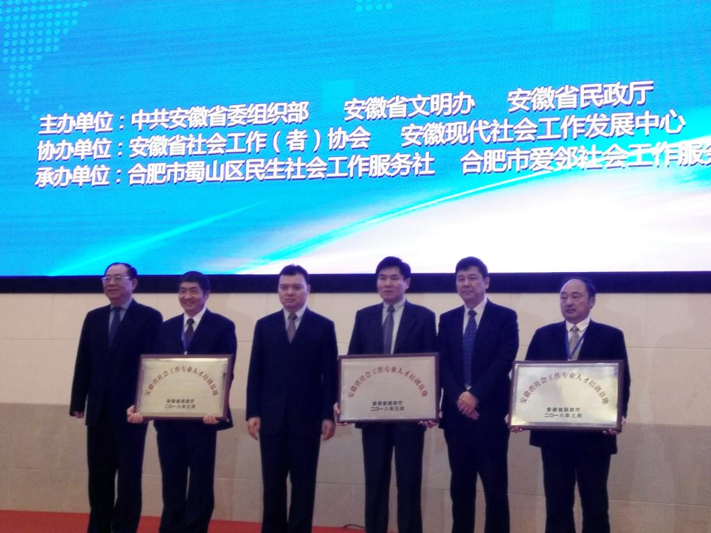 “江淮社工周”系列宣传活动由安徽省委组织部、省文明办、省民政厅联合主办,今年的宣传主题是“牢记社工心 建功新时代”。在启动仪式上,安徽省民政厅党组书记、厅长于勇代表主办方致辞。民政部社会组织管理局副局长刘振国、省民政厅厅长于勇等领导为全省首批社会工作专业人才培训基地授牌,张群代表学校上台领取了安徽省首批社会工作专业人才培训基地牌匾。