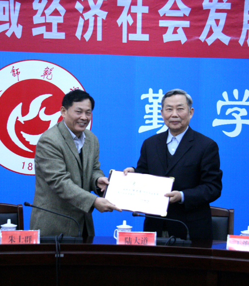 座谈会上,党委副书记、副院长朱士群教授向陆大道院士颁发了“名誉教授”的聘书。