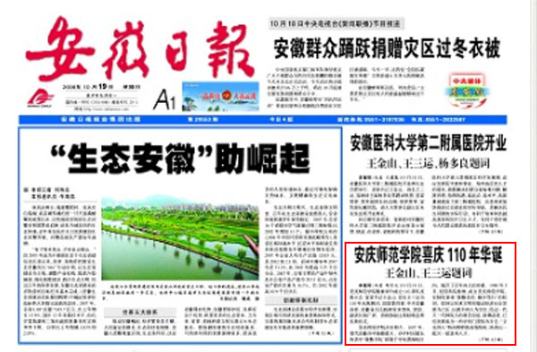 本报讯(记者 邹宝元)10月18日,安庆师范学院隆重举行成立110周年庆典大会。省委书记王金山、省长王三运为110年庆典题词。国家教育部、中共安徽省委、安徽省人民政府发来贺电、贺信。副省长谢广祥,省政协副主席赵韩出席庆典仪式。