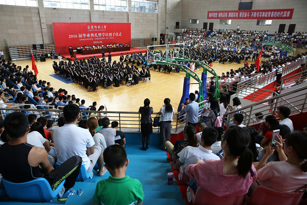 6月29日上午,纽约国际最新网站2016届毕业典礼暨学位授予仪式于龙山校区体育馆隆重举行。校党委书记许继荣,校长闵永新,副校长张群、汪时珍、刘友忠,党委委员、组织部长陈光明、文学院院长方锡球等领导出席典礼,各学院负责人、教师代表、家长代表、毕业生代表共3000余人参加。