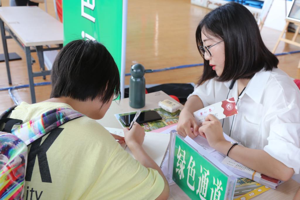 工作人员吴慧从一早来到接待台就不停歇地为新生解答问题,提供咨询信息。“今天看到那么多家庭经济困难的学生来咨询,挺心疼他们的,所以想为他们提供力所能及的帮助。”她介绍,学校今年共准备了50份爱心礼包,里面包括牙刷、水瓶、水盆等基本生活用品,总金额近5000元,爱心礼包也会根据前来“绿色通道”咨询的学生的家庭经济情况来发放。(文/学生记者 韦明慧 图/学生记者 胡蝶)