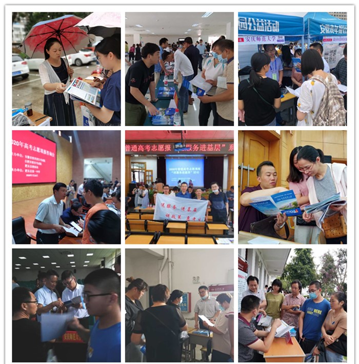 为落实省教育厅和省教育招生考试院温馨高考要求,做好考生志愿填报服务工作,安徽省教育招生考试院、安徽青年报社等组织开展了“送服务进基层”等系列活动。为扩大学校影响,争取优质生源,招生办公室从相关学院抽调熟悉招生政策的领导干部和业务骨干组成6支宣传分队,积极参与所有线路的招生宣传活动。7月23日始,各宣传分队陆续前往歙县、宿松县、池州市、舒城县、桐城市、肥东县、全椒县、阜南县、颍上县等地展开工作。