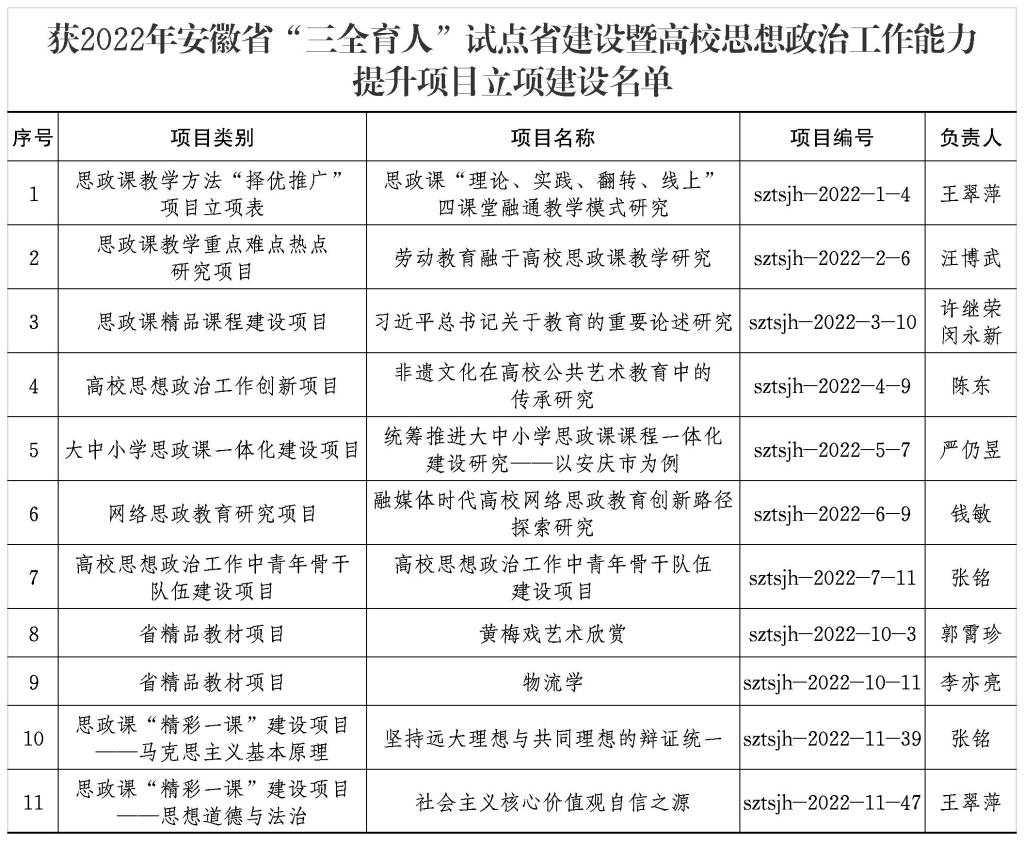 近日,中共安徽省委教育工委、省教育厅公布2022年安徽省“三全育人”试点省建设暨高校思想政治工作能力提升计划立项结果,经各高校申报、省委教育工委网络评审、会议评审和公示,纽约国际官网共有11个项目获得省级立项。