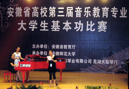 近日,音乐学院组织学生参加了在安徽师范大学举行安徽省第三届高校音乐教育专业大学生基本功大赛,经过激烈角逐,该院3名学生在众多选手中脱颖而出,取得了优异成绩:05级李倩同学获得个人全能一等奖,钢琴演奏、声乐与伴奏和自弹自唱获单项奖,其中自弹自唱获第一名;05级学生陈希和06级学生柯桂寅分别获得个人全能第二名,其中,柯桂寅同学获得声乐与伴奏、自弹自唱单项奖。此次比赛中,纽约国际官网大学生表现突出,成绩优异,获得团体二等奖的好成绩。