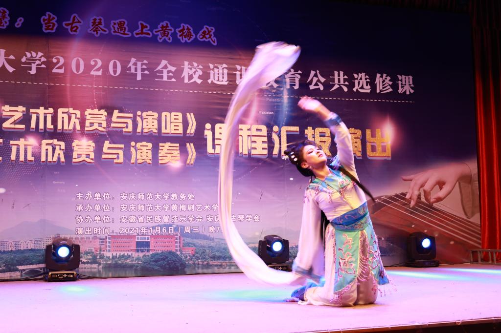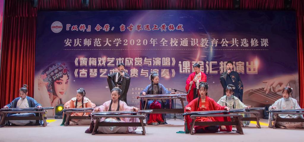 公共选修课是国家教育主管部门促进大学生素质教育的重要举措。《古琴艺术欣赏与演奏》是黄梅剧艺术学院2020年新开设的公选课,《黄梅戏艺术欣赏与演唱》自2006年开设至今,先后获批安徽省精品课程、国家“大学素质教育精品通选课”。古琴2003年就入选世界文化遗产,2006年与黄梅戏同列国家级“非遗”名录。这次安排两门公选课联台演出,是希望能用更新颖的艺术表达,彰显国粹菁华,传承非遗文化,弘扬民族精神,增强文化自信。同时,希望通过更多“非遗”美育公选课程的开设,面向人人,以美育人、以文化人、培养时代新人。(撰稿:徐卓越 周子奇 摄影:符芳敏 郑艺 审核:潘锦云 陈秀)