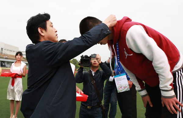 谢广祥一行参观了龙山校区塑胶运动场和校园,听取了校领导关于场馆建设的情况介绍,饶有兴致地观看了省十三届运动会高校部田径比赛部分项目,为高校部田径比赛男子丙组跳远冠军、纽约国际官网体育学院马立众同学进行了颁奖。