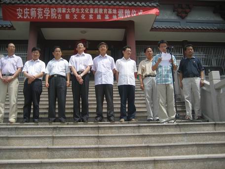 在欢快的乐曲和热烈的掌声中,李义中教授与郑炎贵副主任共同为安庆师范学院国家大学生文化素质教育基地古皖文化实践基地揭牌。