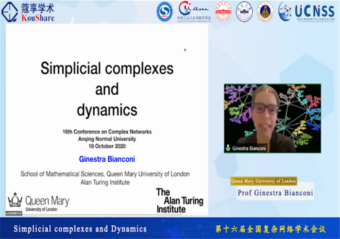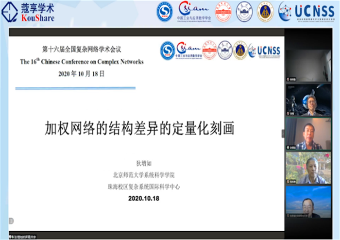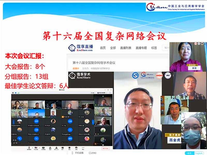 会议历时1天,全程网络直播。开设了1个主会场8个大会报告;14个分会场,即1个专场:超复杂网络与智慧系统,12个专题:COVID-19、复杂网络上的传播动力学、同步动力学、群集动力学、博弈动力学、复杂网络与大数据、链路预测与推荐算法、网络结构分析、网络自组织与交叉应用、网络应用、网络控制、复杂系统及交叉应用;以及1场最佳学生论文答辩,共79个报告。本次大会报告是由中国工业与应用数学学会复杂网络与复杂系统专委会全体委员提名推荐和遴选产生,其中4位个大会报告人分别是:国际系统与控制科学院院士、国务院学位委员会系统科学学科评议组召集人、教育部高等学校教学指导委员会管理科学与工程类专业委员会委员、中国系统工程学会副理事长、北京师范大学狄增如教授,英国阿兰图灵国家研究所(Alan Turing Institute)研究员、国际期刊JPhys Complexity主编、伦敦玛丽女王大学Ginestra Bianconi教授,智能技术与系统国家重点实验室常务副主任、中国人工智能学会副理事长、清华大学学术委员会委员孙富春教授,国家自然科学二等奖获得者、中国自动化学会副理事长、上海交通大学讲席教授席裕庚,4位青年大会报告人分别是:北京航空航天大学自动化科学与电气工程学院副院长王磊教授,剑桥大学王林博士,德国洪堡学者、东南大学许文盈博士,计算神经科学与类脑智能教育部重点实验室副主任、复旦大学赵兴明教授。