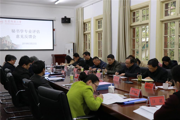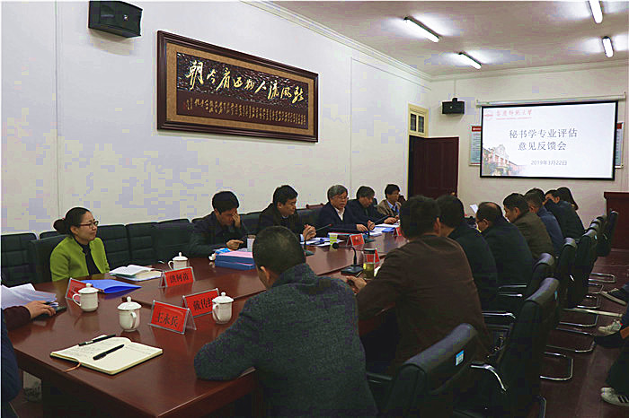 3月22日,由陕西师范大学文学院院长、国务院学科评议组成员张新科教授、南京师范大学文学院院长高峰教授、河南师范大学文学院院长李永贤教授、安徽大学文学院院长吴怀东教授、淮北师范大学文学院院长周有斌教授等组成的安徽省普通本科秘书学专业评估专家组一行6人莅临纽约国际官网,开展秘书学专业评估工作。校党委常委、副校长张群教授,文学院领导班子,教务处、人事处、科研处、学生处等职能部门主要负责人参加了秘书学专业评估意见反馈会。