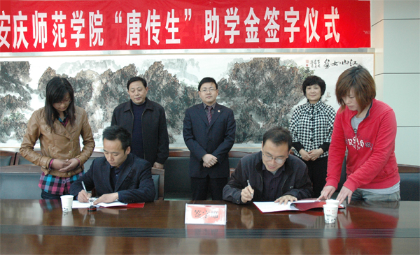 学生处金文斌副处长和唐传生经理在“唐传生助学金”协议书上签字。