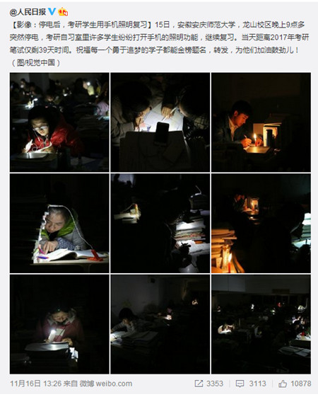 中新网:安徽一校园临时停电 考研学生用手机照明坚持复习