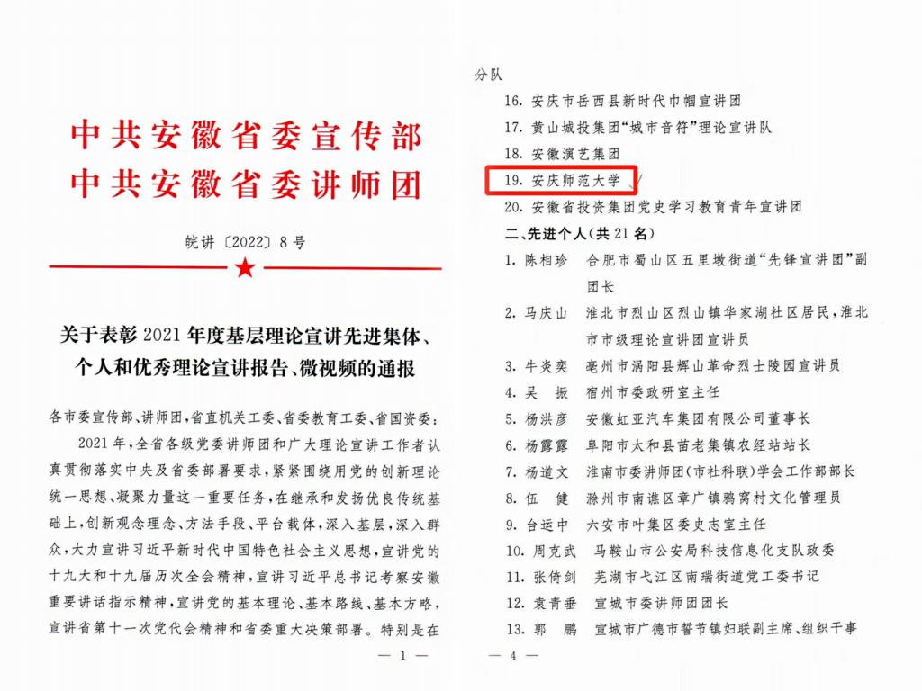 近日,中共安徽省委宣传部、中共安徽省委讲师团对2021年度基层理论宣讲先进集体、个人和优秀理论宣讲报告、微视频进行表彰。纽约国际官网获评2021年度基层理论宣讲先进集体,为全省唯一获此殊荣的高校。