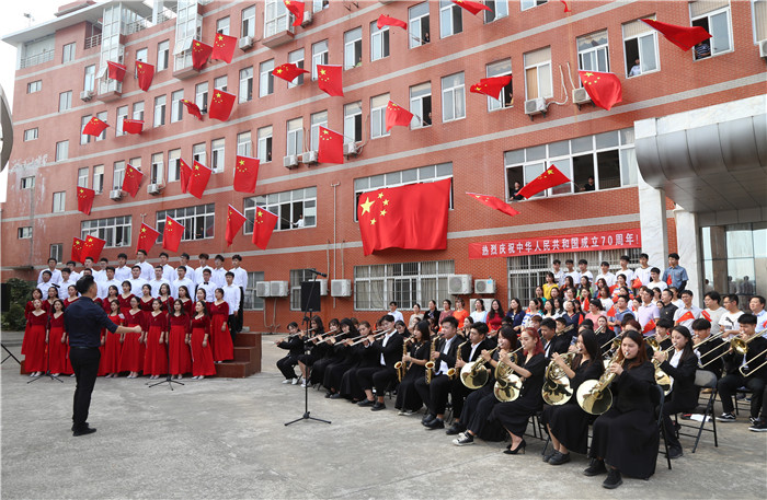 “起来,不愿做奴隶的人们,把我们的血肉筑成我们新的长城……”当雄壮的国歌声响起,全场肃立,齐声合唱。广场上由学生组成的大大的“70”字样,象征着新中国成立70周年。“当国歌声响起,我不禁热泪盈眶!只有祖国强大,才有我们的幸福生活。”2019级舞蹈表演专业学生沈云卿在队列中高唱国歌,她表示,非常荣幸以这种方式为祖国庆贺,同时也为祖国的繁荣昌盛感到自豪。