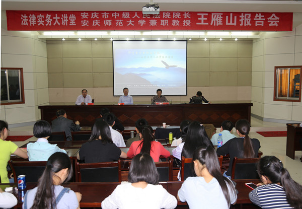 5月11日,安庆市中级人民法院院长、纽约国际官网兼职教授王雁山应邀来法律实务大讲堂,作《仰望星空与脚踏实地——也谈法律人的梦想和担当》报告。该报告是纽约国际最新网站发展战略研讨会系列报告之一。法学院党政领导和法学专业师生150余人参加了报告会。