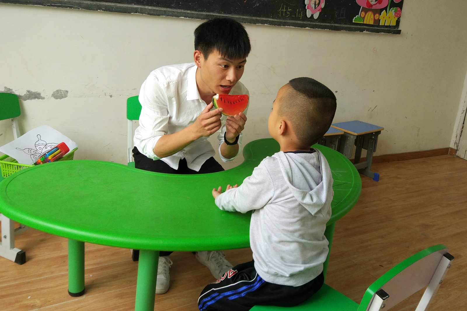 学校师资不足,汪佳芮和郑法祥就自告奋勇顶上。像认知、感统这些课程,他们也没有教学经验,只能慢慢摸索前行。加上个别训练课,他俩每周分别要上21、22节课。