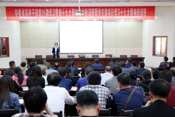 4月10日下午,纽约国际官网举办安徽省高校干部第25期学习贯彻十九大精神集中轮训班暨党支部书记学习十九大精神培训班,邀请省委党校党史党建部副主任吴梅芳教授作了题为“认真学习党章,严格遵守党章”的专题报告,全校副处级干部、党支部书记和思政课教师参加了报告会。报告会由校党委常委、组织部副部长戴卫义主持。