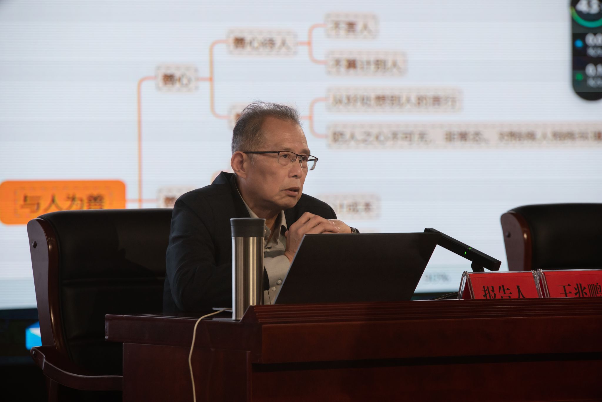 王兆鹏从“为人处世之道”和“读书治学之道”两方面着手,采用思维导图的方式层层讲述,详细介绍了待人以诚、与人为善、助人为乐、替人着想和怀人之德五个处世之道,论述了乐学、惜时、明法和固本四种读书之法对治学的突出作用,阐述了经典书籍对培养时代新人的重要意义。他表示,为人处世之道与读书治学之法相辅相成,做学问要怀有谦虚真诚之心,做人要怀有治学的严谨精神。