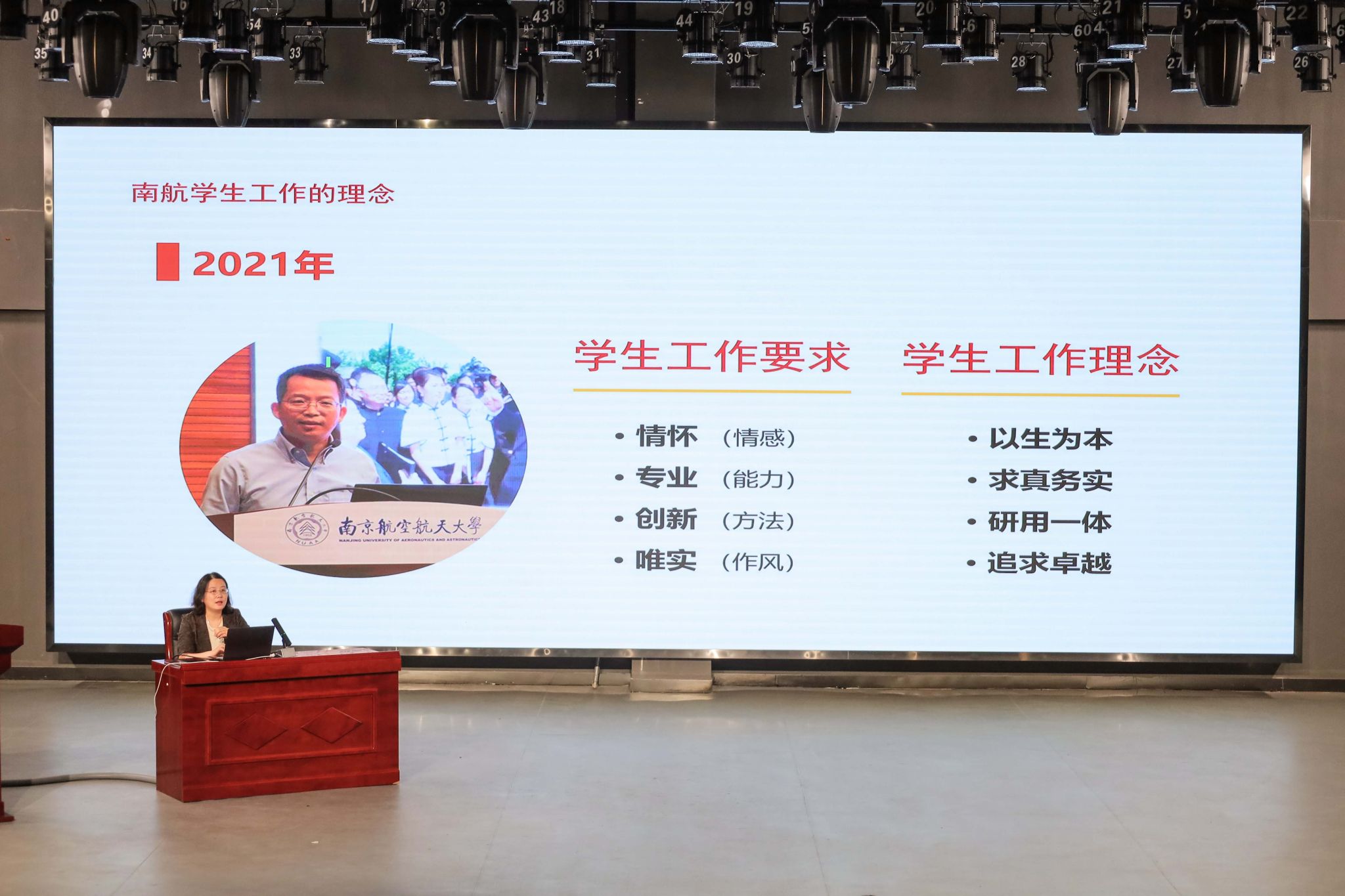 南京航空航天大学党委研究生工作部副部长、江苏省第四届辅导员职业能力大赛一等奖获得者、江苏省2016辅导员年度人物雷蕾以《传承红色基因 立足行业特色 服务学生成长——一名学生工作者的思与行》为题,回顾了我国高校辅导员制度的历史变革,介绍了南航学生思政工作的背景和特点,分享了 工作心得。呼吁全校辅导员努力做到持续奋斗和矢志创新相结合,“坐而论道”和“起而行之”相结合,底线思维和高线思维相结合,分工负责和协同联动相结合,争做学生工作的领航人。