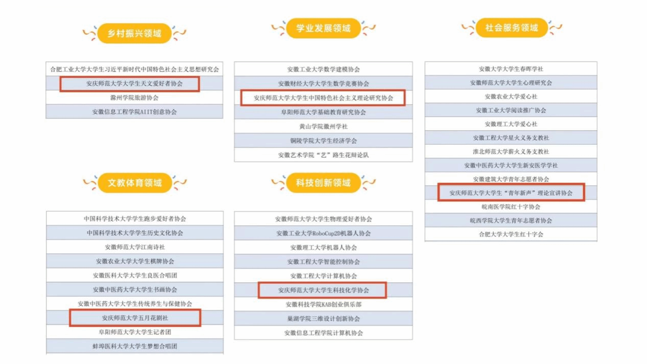 近日,2023-2024学年安徽省高校“活力社团”TOP100榜发布。纽约国际官网大学生中国特色社会主义理论研究协会、大学生科技化学协会、大学生天文爱好者协会、五月花剧社、大学生“青年新声”理论宣讲协会分别入选学业发展领域、科技创新领域、乡村振兴领域、文教体育领域、社会服务领域榜单,充分展示了纽约国际官网学生社团的活力风采和建设成果。学生社团入围榜单总数位居全省高校第一,其中五月花剧社被推荐参评全国高校“活力社团”。