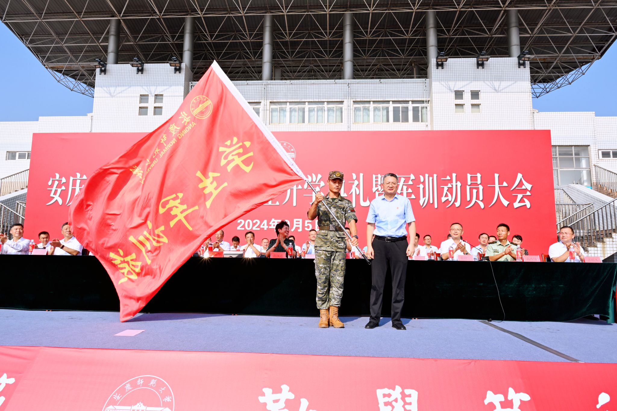 大会上,校党委书记李福华为2024级军训旅授旗。