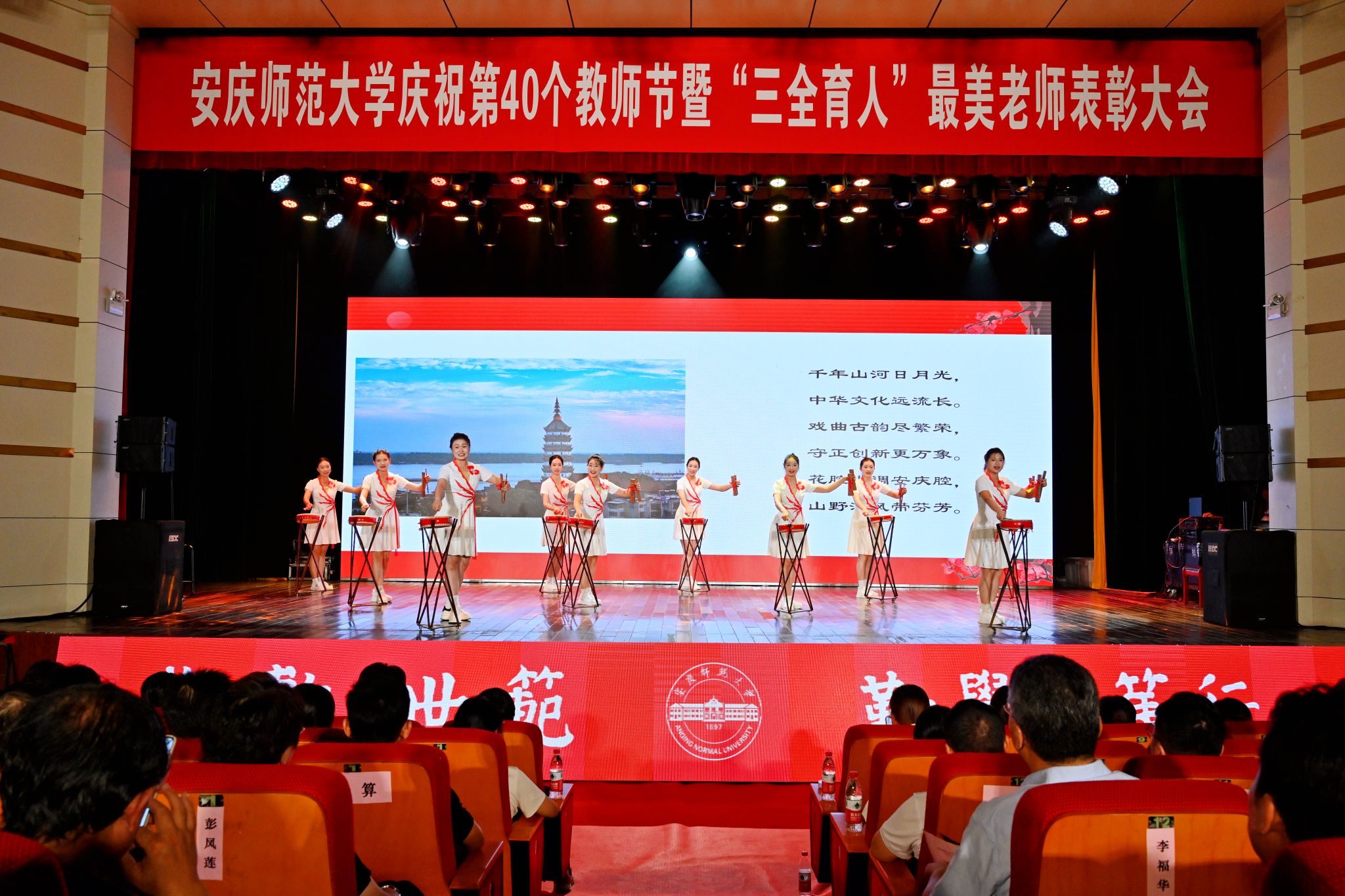 开场节目黄梅大鼓《黄梅戏情代代传》,呈现了韩再芬等一批黄梅戏艺术家们锲而不舍的改革与创新实践,激励全体师生乘势而上,奋发勇为。黄梅戏《邓稼先》选段“祖国强大我梦牵”,展现了邓稼先先生对祖国的深情厚意和对科学事业的执着追求,现场师生深受感动、备受激励。歌伴舞《老师我总是想起你》,深情讴歌了教师敬业爱生、无私奉献的精神。