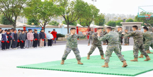 刺杀操的表演,一招一式迅猛而精准;擒敌术的展示,无论是摔打擒拿还是锁喉制敌,动作坚定有力;器械训练的演示,官兵们或翻腾跃起,或稳健悬挂,尽显力量与技巧之美。这一系列的演示科目引得现场的学生们连连称赞。法学专业2021(5)班的张星苗直呼:“太震撼了,真正的铁血精神被展现得淋漓尽致!”在她看来,每一个动作背后都透露出日复一日刻苦训练的汗水与坚持。